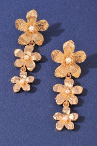 Triple flower textured gold metallic earrings with pretty pearl centers. Hangs about 2 1/2 inches long.