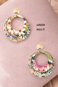 Double hoop gold earrings dangling from gold hammered stud on a beautiful floral, jingle shimmering print. Hangs about 3 inches.
