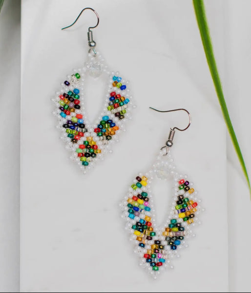 This dazzling earring in white has a rounded kite shape with a multi colored bead pattern. For a touch of elegance, this stunning earring is topped with a sparkling crystal.